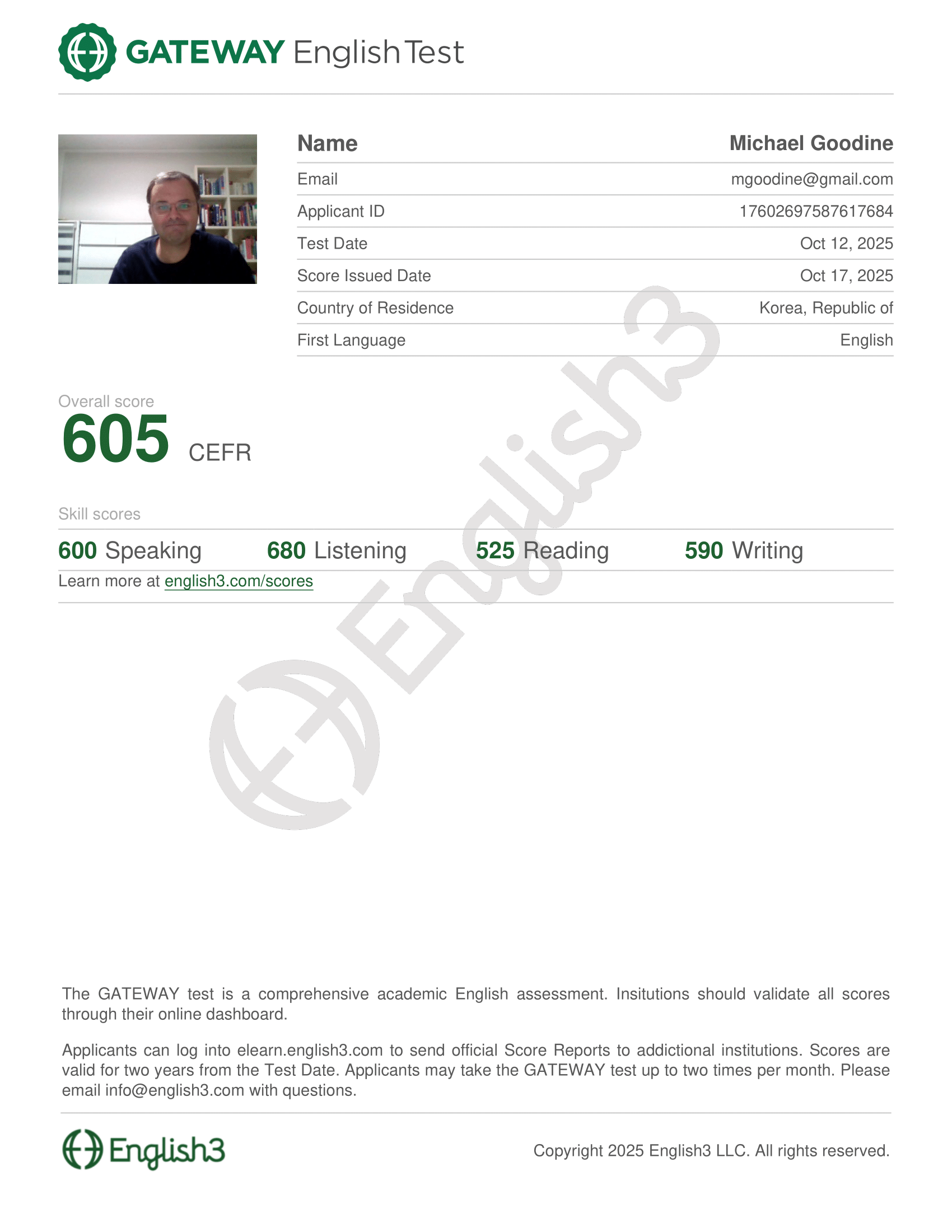 Scoring is wonky. The maximum score is supposed to be 600 points. I scored 605 points. My listening score was 680/600. Whoops.